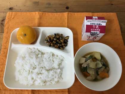 鶏肉と野菜の煮もの、ひじき豆、みかん(冷)、ごはん、牛乳