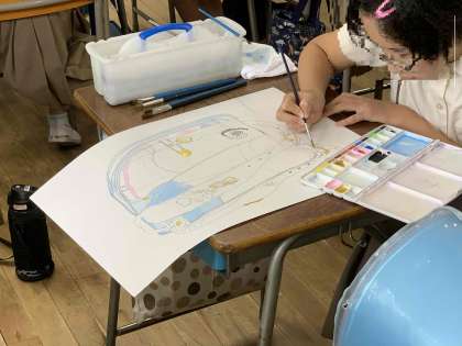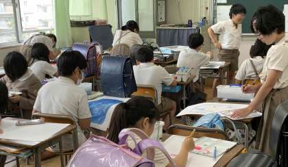 図画工作科の時間にランドセルの絵を描いています。