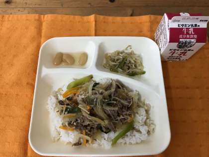 牛丼、もやしとピーマンのごまいため、大福豆の煮もの、牛乳