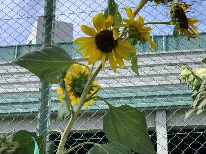 学習園をのぞきに行くと、背の高いヒマワリが倒れたり、折れたりしていました・・・。