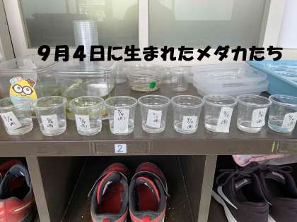 小さなコップの中には赤ちゃんメダカがいっぱいです。