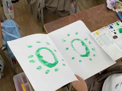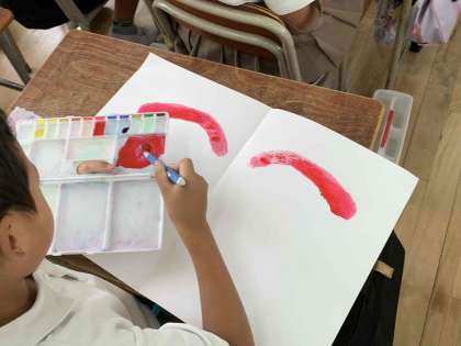 という題材で、画用紙を半分に折り、広げた片方に絵の具で模様を描きます。