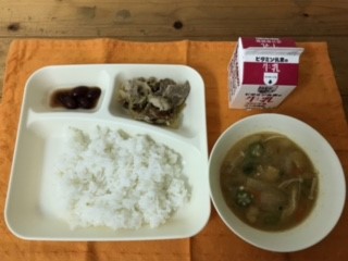 豚肉の甘辛焼き、とうがんのみそ汁、金時豆の煮もの、ごはん、牛乳