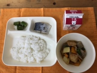 さごしの塩焼き、含め煮、オクラのいためもの、ごはん、牛乳