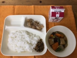 子どもたちは、「からあげだ!」ととても喜んでいました。からあげとは、味つけが少し違うことに気がついてくれるとうれしいです。(栄養教諭)