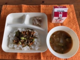 もずくと豚ひき肉のジューシー、さつまいものみそ汁、焼きれんこん、牛乳
