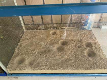 3つ目のウスバカゲロウの幼虫「アリジゴくん」はまあるい穴がいろんなところに増えていきます。子どもたちは珍しそうに眺めています。
