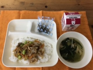 ピリ辛丼の辛味は、ごはんがすすみ程度の辛味でちょうどよかったです。枝豆も使いましたので、歯ごたえがあっておいしかったです。(栄養教諭)