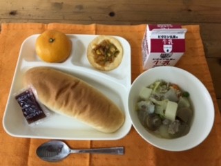 豚肉と野菜のスープ煮、変わりピザ、みかん、コッペパン(いちごジャム)、牛乳