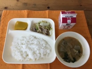 豚肉と野菜のいためもの、いわしのつみれ汁、かぼちゃういろう、ごはん、牛乳