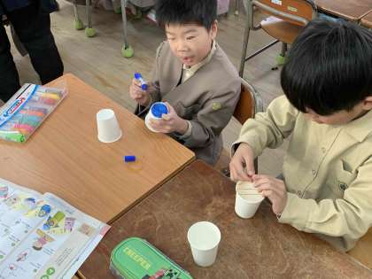 今日は紙コップ2つをを使って、ぴょんカップを作りました。