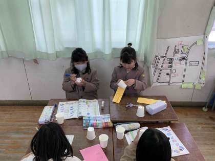 輪ゴムをクロスして紙コップに貼るところが少し難しそう。