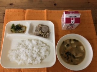 今日の「きくなとはくさいのごまあえ」に使っているきくなは、大阪府で育てられたものです。きくなは、ほどよい苦味でごまともよく合っていたので、児童は「おいしい。」と言って食べていました。冬が旬の野菜ですので、おひたしや鍋もので、きくなの苦味を楽しんでほしいです。(栄養教諭)