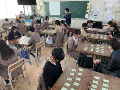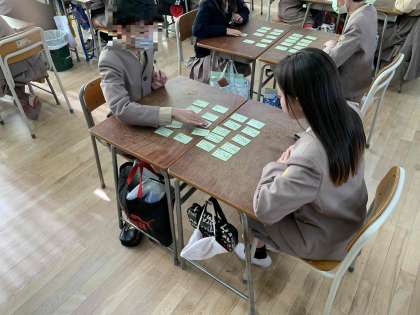 昨年も取り組んだようですが、5色百人一首札を使って、1対1で対戦をしました。