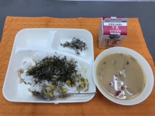 ぞう煮は、関西でよく食べられる白みそを使ったぞう煮です。金時にんじんも使いました。ごまめは、田作りとも言われる料理です。昔、田の肥料としてイワシをまいたところ、豊作になったことから、豊作を願う気持ちがこめられています。(栄養教諭)
