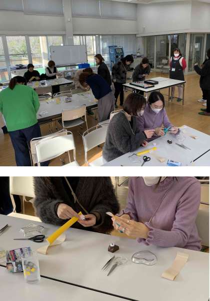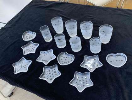 まずは、ガラスアートを行い、個性豊かなお皿やグラスが出来上がりました。