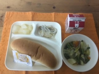 あじのレモンマリネ、てぼ豆のスープ煮、和なし(カット缶)、コッペパン(マーマレード)、牛乳