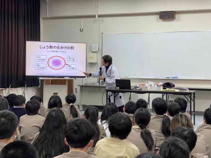 風邪薬等、体調を崩したときに処方される薬のつくりや服用の仕方などを学ぶとともに、薬物についても教えていただきました。