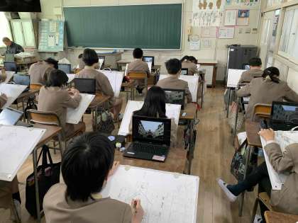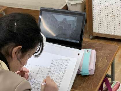6年生はこれまで使ってきた校舎の様子を、パソコンで写真に撮り、描いています。