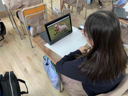 子どもたちはパソコンを使って、動いている動物の写真を探し、下絵に取り組みました。