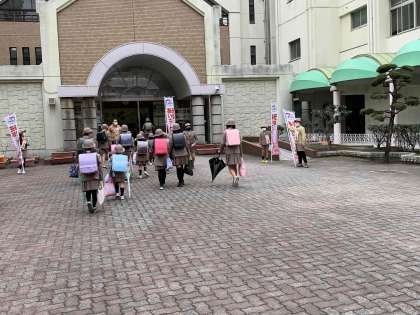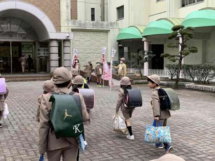 児童会の子どもたちがのぼりをもって、登校してくる子どもたちに