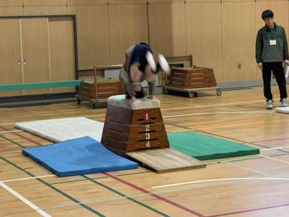 台上前転は1段の跳び箱にマット乗せて練習する子、高い段に挑戦する子など自分の力にあったところで、意欲的に練習をしていました。