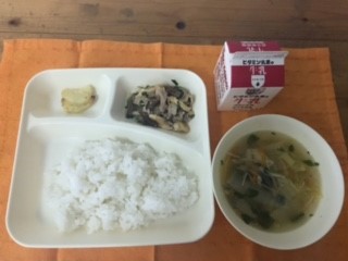 豚肉と干しずいきのみそ煮、すまし汁、あげ焼きじゃが、ごはん、牛乳
