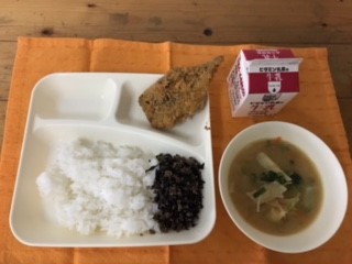 いわしフライは、衣がついた冷凍のいわしフライを給食室で揚げました。骨ごと食べられる魚のフライでも、骨が気になってしまうことが多いのですが、衣がしっかりして噛み応えがあったので、骨をあまり気にせず食べることができました。(栄養教諭)