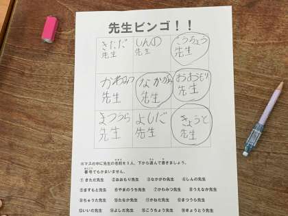 9つのマスに先生の名前を入れ、カードを完成させてスタートです。