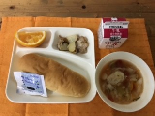鶏肉とじゃがいものガーリック焼き、ウインナーとてぼ豆のスープ、デコポン、コッペパン(ブルーベリージャム)、牛乳