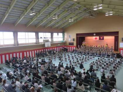 77人の1年生が保護者の方々とともに、正門をくぐり、入学式に参加しました。