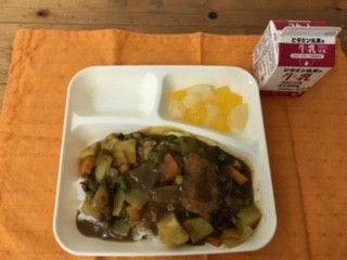 カツカレーライス、フルーツゼリー、牛乳