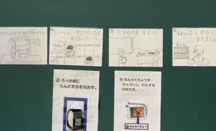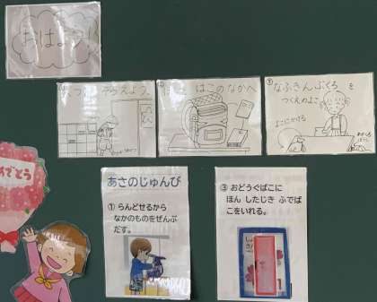 教室では、することがわかるように、絵を掲示し、スムーズに準備ができるようにしています。