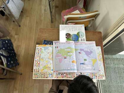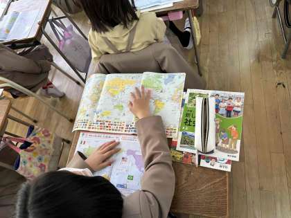 地図帳をひろげて、世界の国の位置や国旗について調べました。