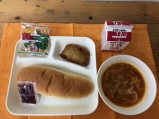 一口トンカツ、ミネストローネ、豆こんぶ、コッペパン(いちごジャム)、牛乳