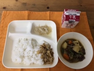 みそ肉じゃが、もやしの甘酢あえ、ごまかかいため、ごはん、牛乳