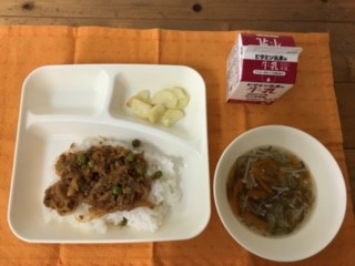 じゃがいもに塩とサラダ油を絡めて、オーブンで焼きました。食缶のふたを閉めていても、よい香りがするので、子どもたちは、給食を運ぶ時から楽しみにしていました。(栄養教諭)