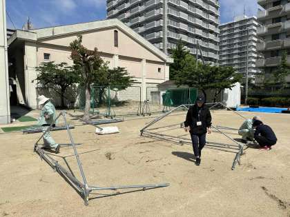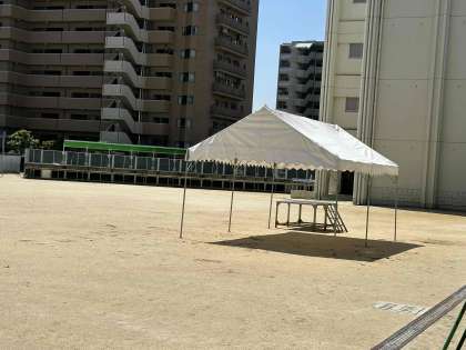 運動場での練習も増えていく中、熱中症対策としてテントを立てました。