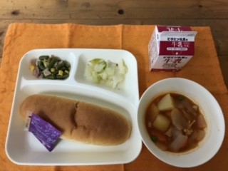 ケチャップ煮、ベーコンとさんどまめのソテー、キャベツのバジル風味サラダ、コッペパン(ブルーべリージャム)、牛乳