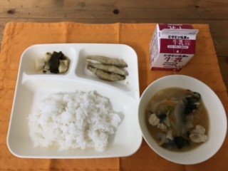 きびなごてんぷら、みそ汁、わかたけ煮、ごはん、牛乳