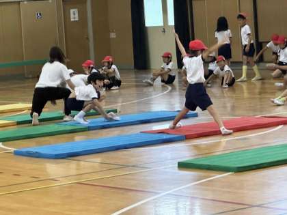 3年生は3クラス合同で、マット運動の学習に取り組みました。