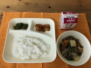 肉じゃが、あつあげのみそだれかけ、オクラのおかかいため、ごはん、牛乳