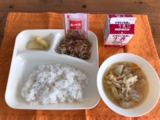 ゴーヤチャンプルー、五目汁、あげ焼きじゃが、ごはん、牛乳