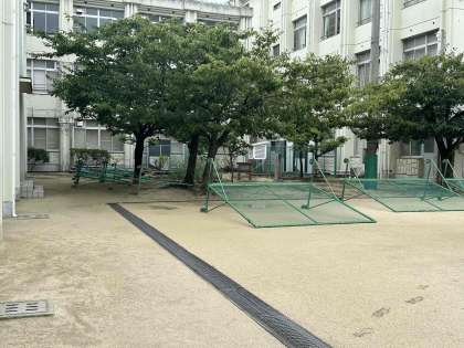 台風に向けて、防球ネット、一輪車、竹馬、サッカーゴール、プール周辺など被害を最小限にできるよう備えました。