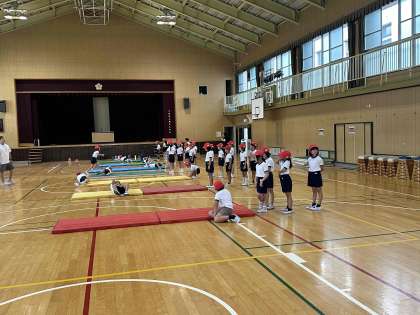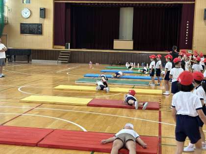 体をまっすぐにして転がったり、体を丸くして転がったりといろいろな転がる運動をしました。