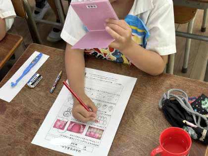 歯を赤く染めて、磨き残しはないか鏡を見て確認しました。