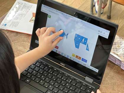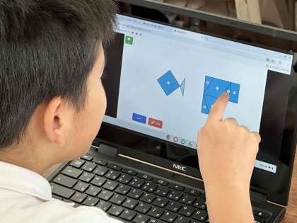 これまでは、紙を切ってのりで貼って・・・と、形づくりの学習は時間がかかりましたが、パソコンなら、指を使って簡単にタイルを動かせ、やり直しもすぐにできます。