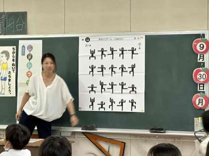 音楽の時間に、ボーズの図を見て、そのまま同じポーズをするという活動をしていました。