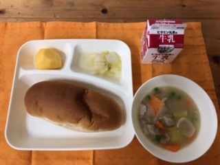鶏肉とさつまいものシチュー、はくさいのピクルス、かき(平核無柿)、黒糖パン、牛乳
