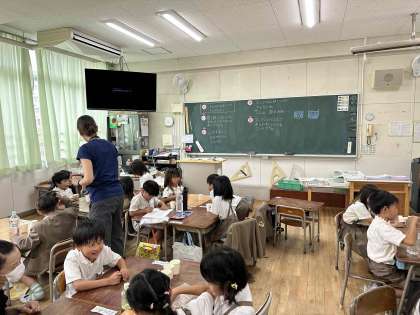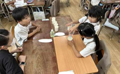 子どもたちは班で協力して、コップに水を移して、比べました。